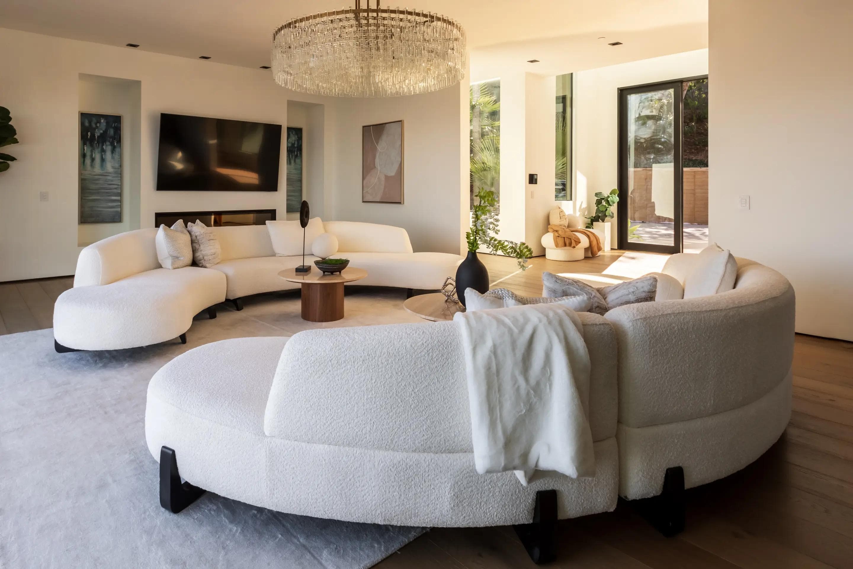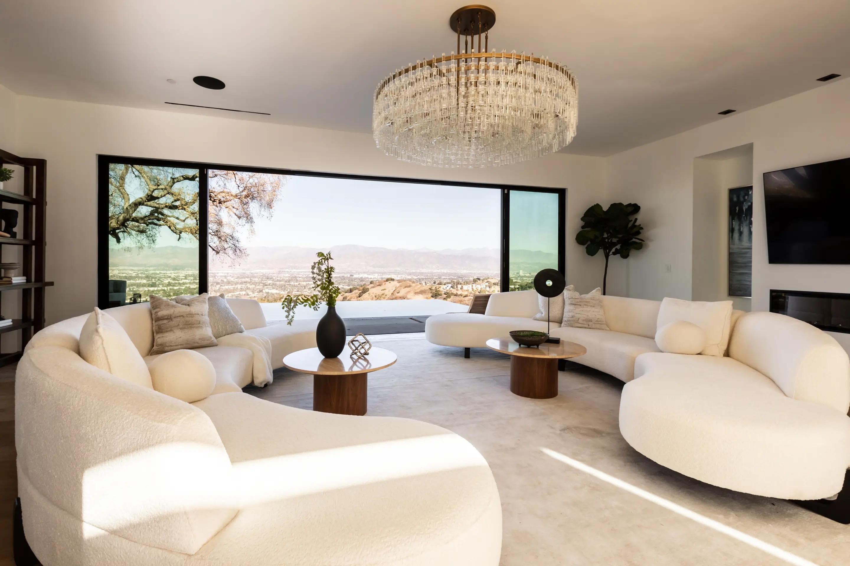 Major improvements to the private driveway off Mulholland, including safety enhancements and quality of life enrichments to make for a seamless approach. An unparalleled retreat offering uncompromising privacy along Mulholland Drive, you are transported into a one-of-a-kind, gated compound with breathtaking 220-degree views, ensuring seclusion, splendor, and exclusivity. Spanning nearly 7,000 sq ft, this home features 6 bedrooms, 6 bathrooms, and timeless sophistication. Upon arrival at the gated motor court, a striking waterfall greets you, accompanied by a double and single garage and additional parking for 5-6 vehicles. Entering through a dramatic pivot door, every room opens into expansive views. The main floor is designed for entertaining, offering formal and casual living spaces, a dining room, and an en-suite bedroom with European oak floors throughout. The kitchen embodies refined elegance, featuring bleached walnut and elephant grey paneling, Thermador and Wolf appliances, two dishwashers, a dual-zone wine fridge, and a spacious hidden walk-in pantry. The upper floor, accessible from east and west wing staircases, includes the sumptuous primary suite, 3 additional en-suite bedrooms, an office, and a laundry room. The nearly 1,000 sq ft primary suite boasts two expansive walnut-clad walk-in closets, a luxurious bathroom with leathered marble finishes, and a private living area with wrap-around balconies. The outdoor spaces are highlighted by an infinity pool, a large grassy al fresco dining area, and mature oak trees that frame the panoramic views, harmonizing the home with its natural surroundings. This residence epitomizes privacy, natural beauty, and impeccable design.