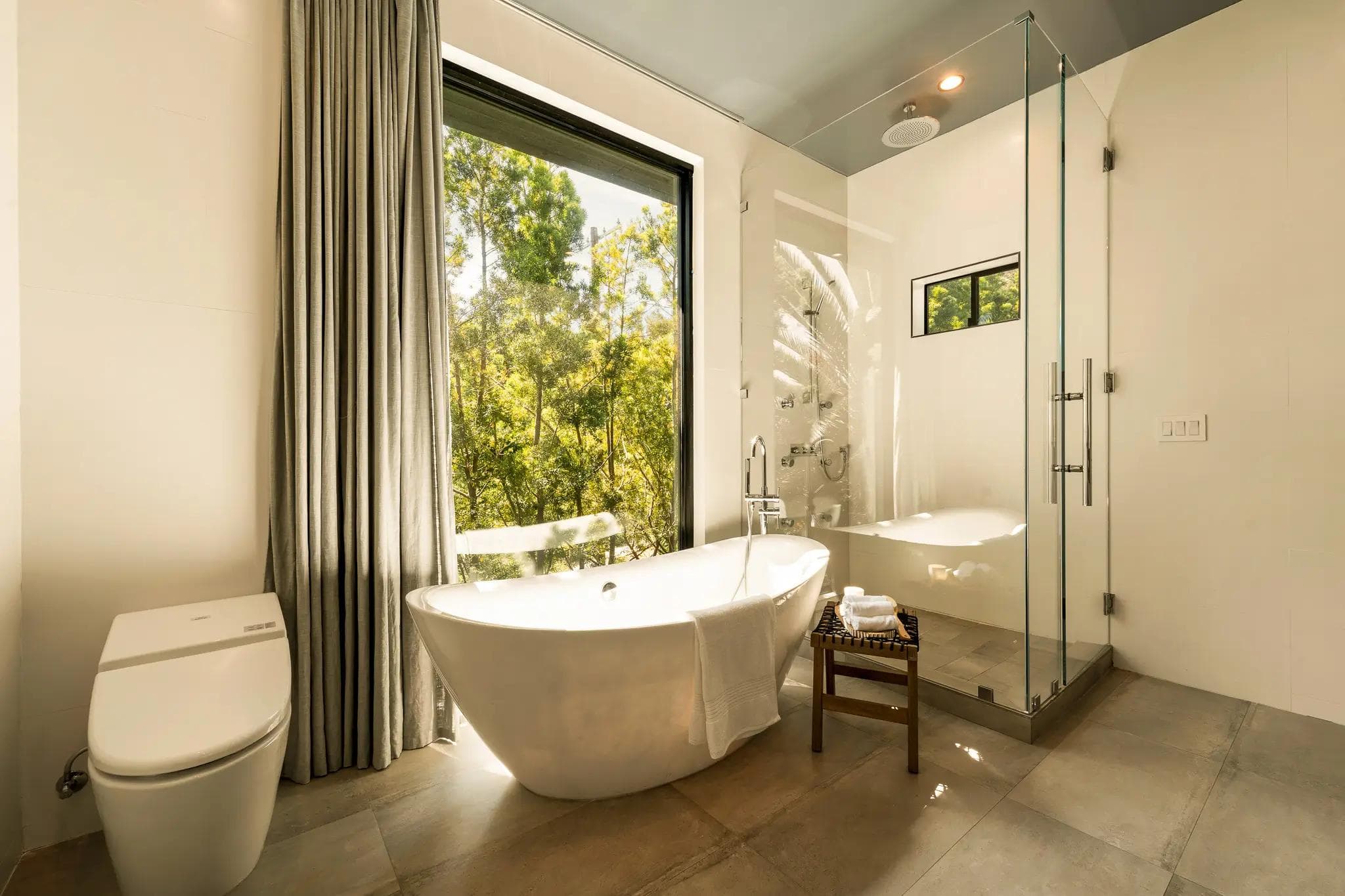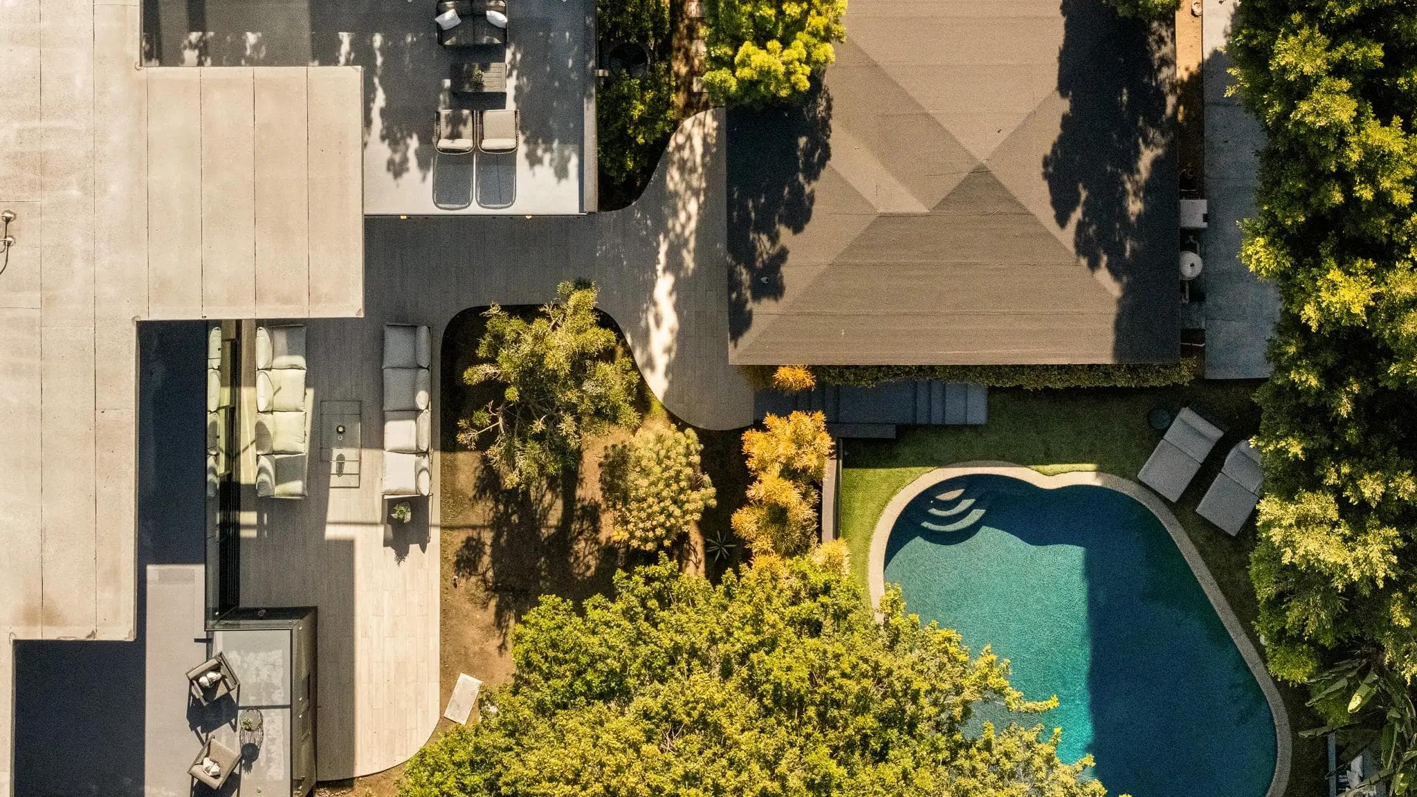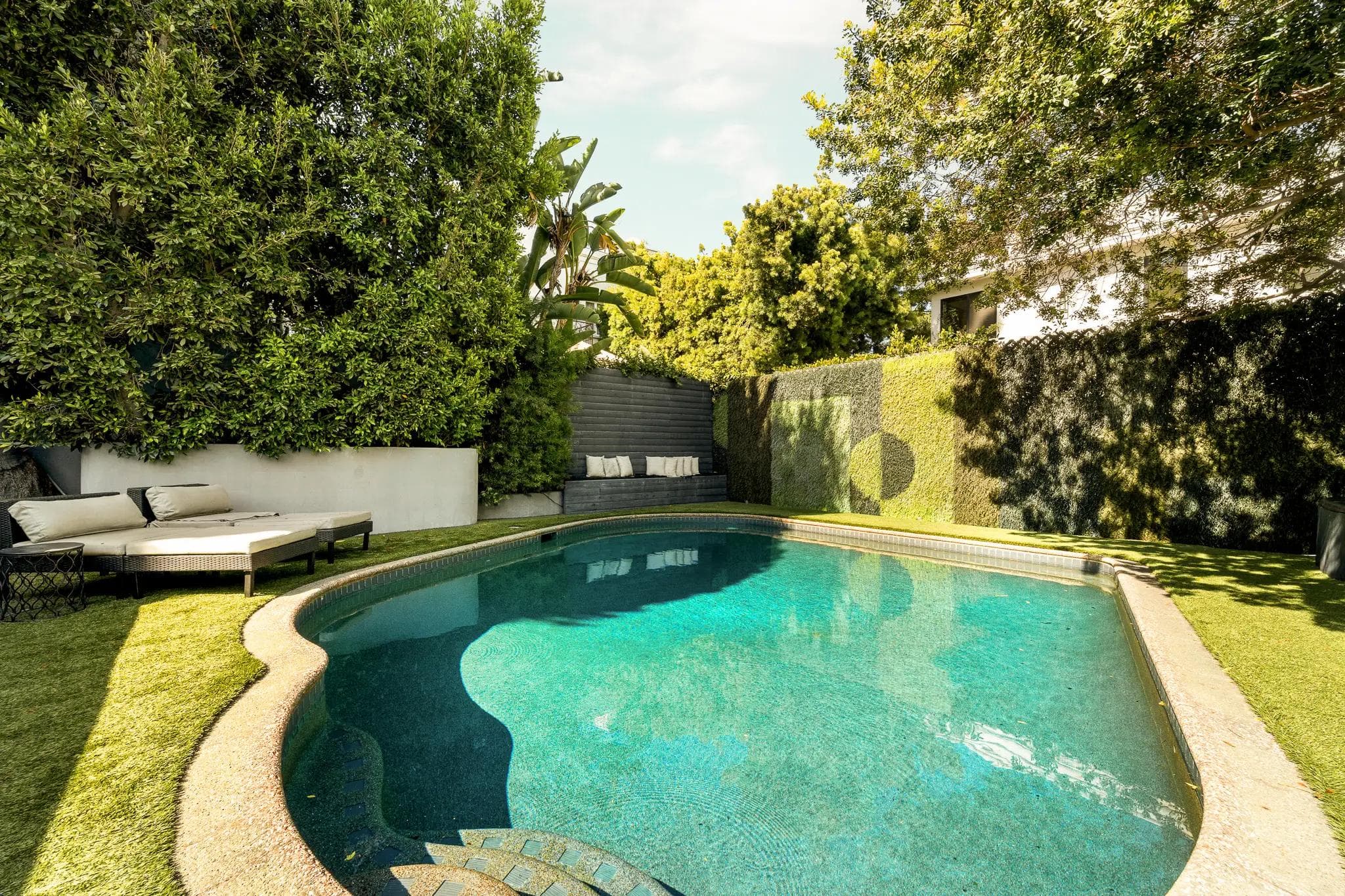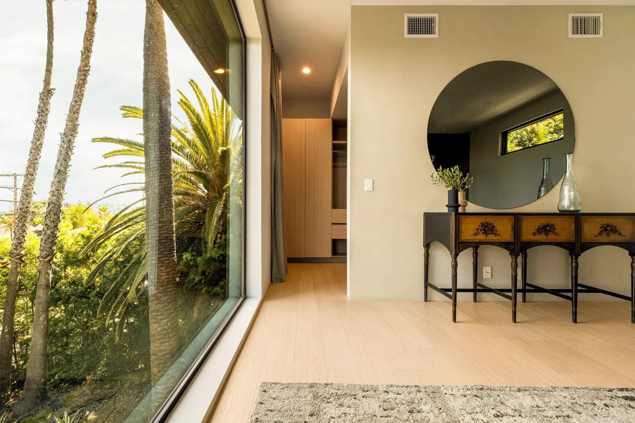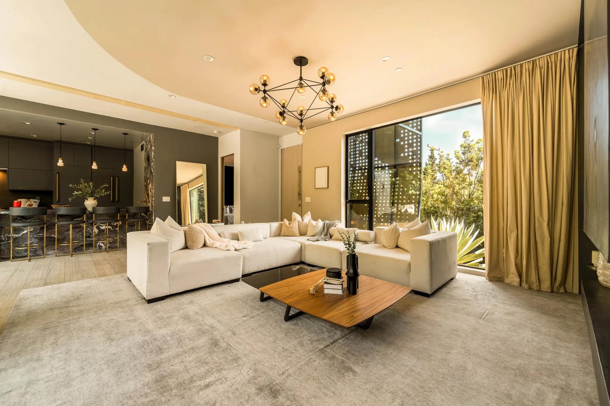 A true architectural sanctuary, this modern estate offers a rare blend of privacy, thoughtful design, and refined comfort. Designed for both everyday living and exceptional entertaining, it sits on a private lot of just over 9,000 square feet. It is a true oasis surrounded by lush greenery and a sense of complete tranquility. Privately gated and located just minutes from Runyon Canyon and the Sunset Strip, the home makes a striking impression with its bold exterior brass facade and soaring 21-foot entry ceilings. The interior reveals white oak floors that lead into an expansive great room anchored by a sleek fireplace. The dining area and chef's kitchen feature La Cornue appliances, dual sinks, and a SubZero custom refrigerator and freezer. Floor-to-ceiling Fleetwood glass doors open to a generous outdoor setting with a saltwater pool, geometric green wall, and multiple areas designed for entertaining and relaxation in complete privacy. The main level includes three bedrooms. One offers an en suite bath with a beautifully crafted marble sink. Another bedroom provides flexibility as an office or guest suite. On its own upper level, the primary suite serves as a private escape with two glass-enclosed terraces that capture sweeping views of the city skyline and surrounding hills. The en suite bathroom includes dual vanity sinks, a large walk-in shower, and a freestanding soaking tub. Every element of this home reflects architectural integrity, tranquility, and a highly desirable lifestyle in one of Los Angeles' most sought-after enclaves.
